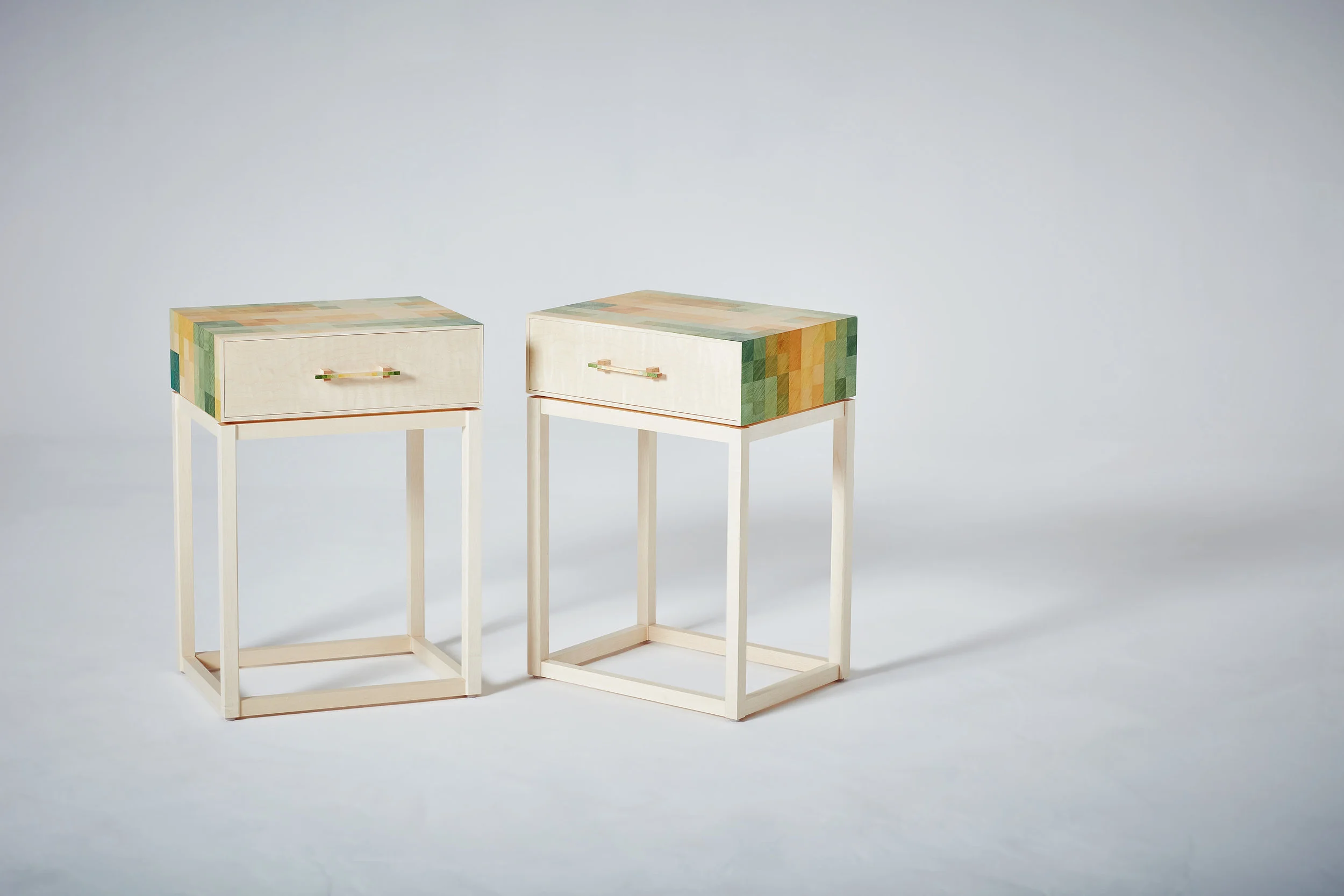 Side tables in bleached sycamore, ripple sycamore and hand dyed sycamore. 39cm wide x 30cm deep x 65cm high. 2015.